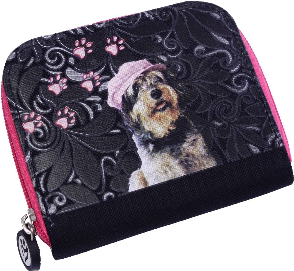 Denarnica z motivom kužka. Mere denarnice so 12X9 cm in se zapira na ježka.