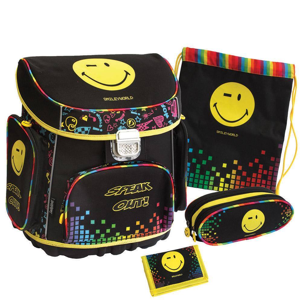 Smiley set vsebuje šolsko torbo, vrecko za copate, denarnico in ovalno peresnico. Šolska torba ima ergonomsko oblikovano hrbtišče, trdno in stabilno dno ter široke in čvrste naramnice. Torba se zapira na clip in je primerna za prva tri leta osnovne šole. Dimenzije 32×41×20cm. Vrečka za copate je iz lahkega in kvalitetnega materiala. Dimenzije: 38×32 cm. Ovalna peresnica z eno zadrgo, ki je primerna za šolo. Dimenzije: 9 x 22 cm. Mere denarnice so 12X9 cm in se zapira na ježka.