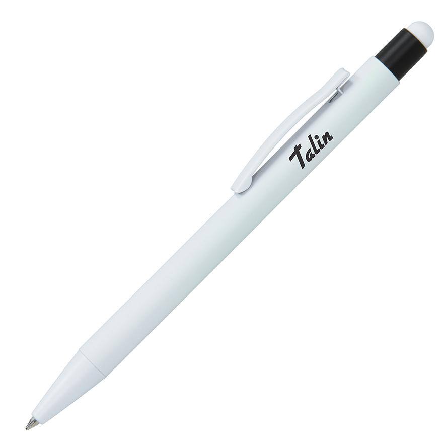 Kovinski kemični svinčnik TALIN z 1,0mm modrim polnilom ter aluksiranim spdonjim slojem v barvi gumijaste kapice, kar omogoči zelo lično barvno promo predstavitev. Kapica ima dodatno funkcijo pisanja na zaslon.