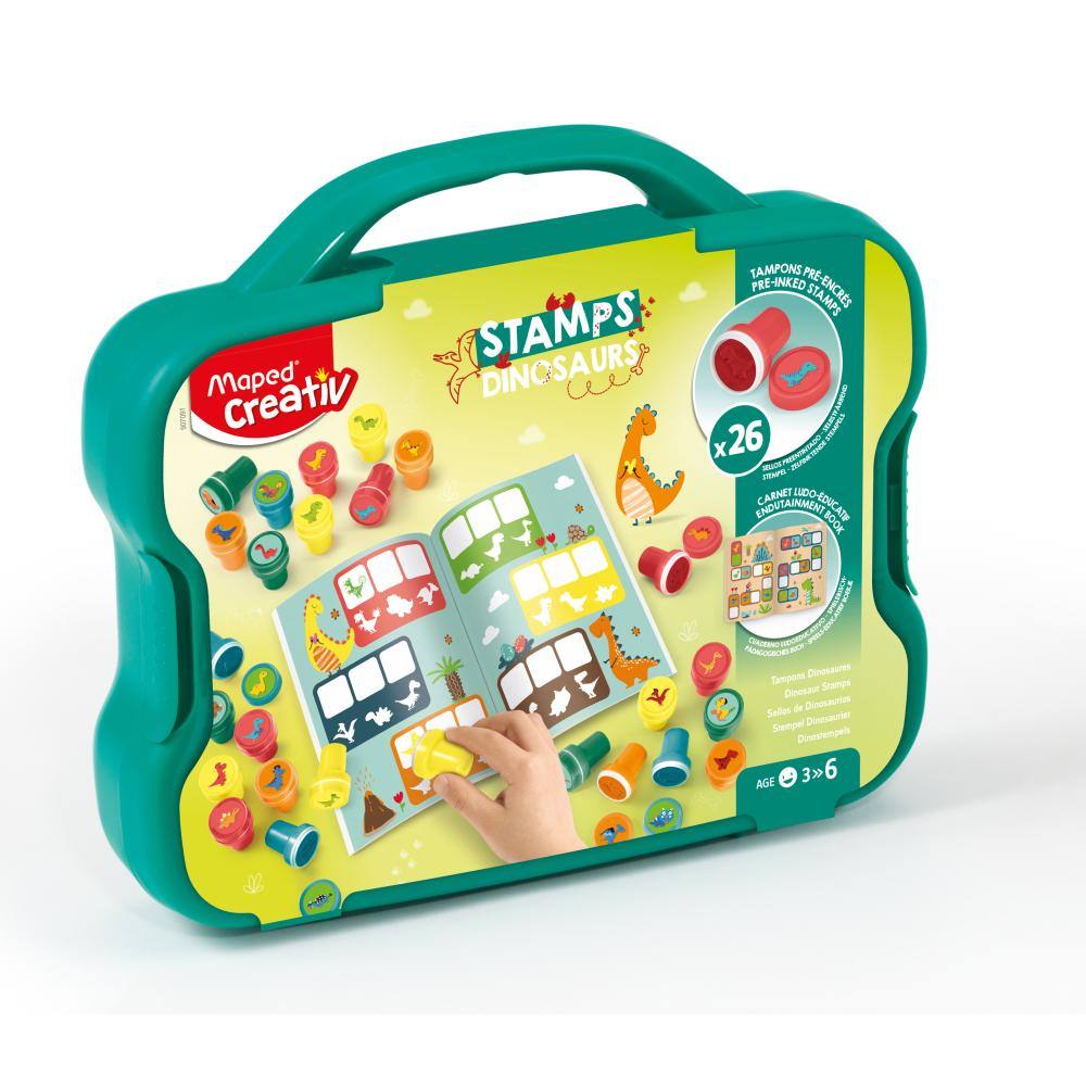 - Kreativni set Maped štampiljke dino.#13#10- Set vsebuje 26 ergonomsko oblikovanih štampiljk z motivi dinozavri in zabavno knjigico.#13#10- Primerno za otroke od 3.leta naprej.