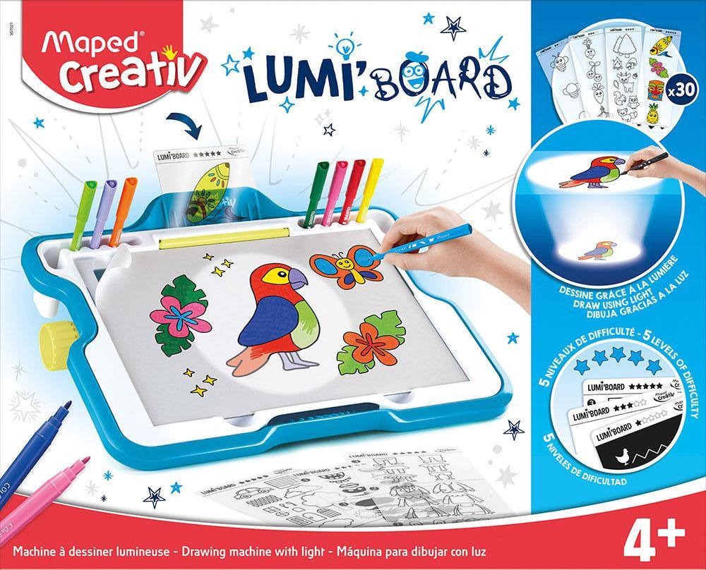 "Enota za risanje LUMI - učite se risati in ustvarjati ter se ob tem neizmerno zabavajte. Tabla vam z svetlobnimi efekti prikaže predloge po katerih boste ustvarili krasne risbe. Potrebna uporaba baterij (4x AA - niso vključene).