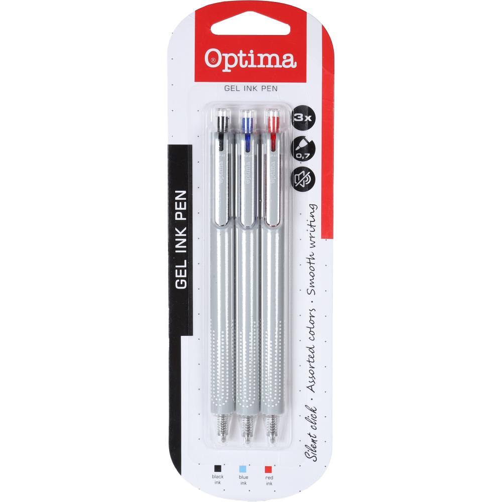 - Set treh kemičnih svinčnikov OPTIMA v modri, črni in rdeči barvi.#13#10- Debelina mine: 0,7 mm.#13#10- Silent click tehnologija - neslišni klik, prijeten na otip.#13#10- Idealni za pisanje naslovov, poudarjanje in podčrtavanje.#13#10