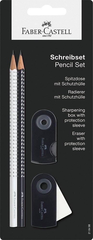 set Faber Castell vsebuje dva grafitna svinčnika Sparkle z trirobno grip obliko, mina je ojačana in odporna na lomljenje. V setu sta tudi radirka z ohišjem in šilček v lončku.