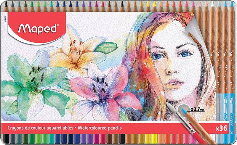Barvice Artists Maped so kakovostne akvarelne barvice za ljubitelje risanja. Barvice imajo ergonomsko obliko za boljši oprijem in ojačano mino proti lomljenju, debeline 3,7mm. Barve so intenzivne z akvarelnim učinkom. Barvice so pakirane v privlačni kovinski embalaži z priloženim čopičem. V setu je 36 barvic + okrogel čopič.