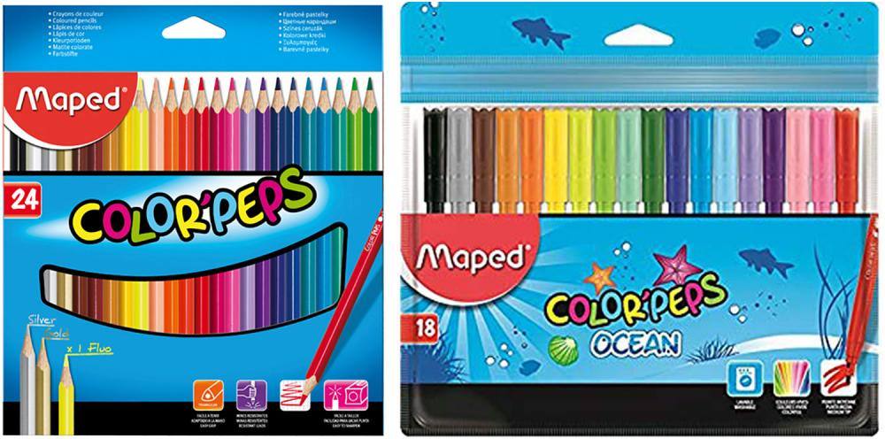 set Maped vsebuje 24 kos kakovostnih barvic z trirobno obliko, mino odporno proti lomljenju in 18 kos flomastrov.