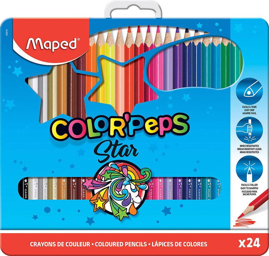 kvalitetne barvice Maped z trirobno obliko za boljši oprijem, ojačano mino in intenzivne barve. V kovinski embalaži je 24 različnih odtenkov.