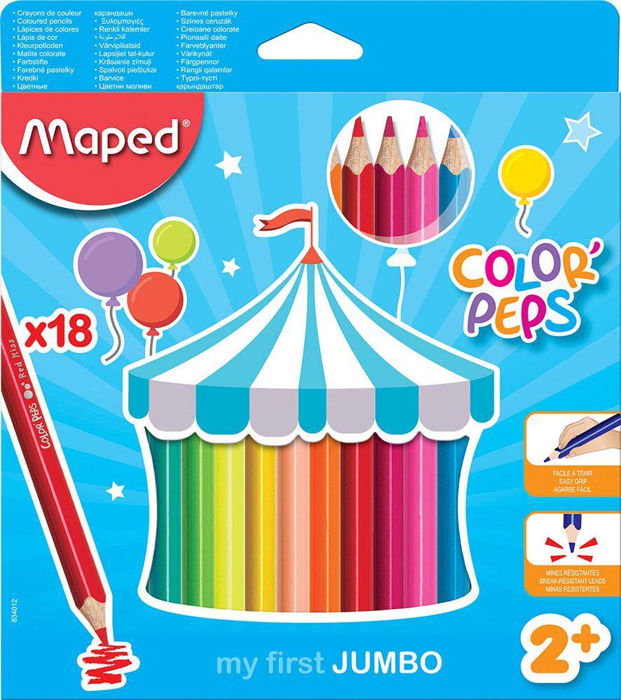 Barvice Maped so kakovostne barvice, mine so odporne na lomljenje, odtenki pa so intentivni. Jumbo velikost omogoča mlajšim otrokom pravilen in lažji oprijem barvice. V kartonski embalaži je 18 različnih odtenkov.