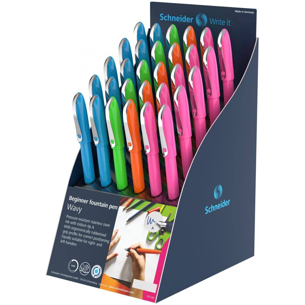 Nalivno pero Wavy v displeju.#13#10- Idealno nalivno pero za učenje pisanja.#13#10- Iridijeva konica, odporna na pritisk. #13#10- Ergonomska oblika in mehak oprijem#13#10- Za desničarje in levičarje. #13#10- V displeju 30 nalivnih peres, mix barv.