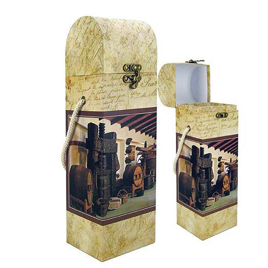 Kartonska škatla za steklenico Barrel s potiskom in kovinskim zatičem.