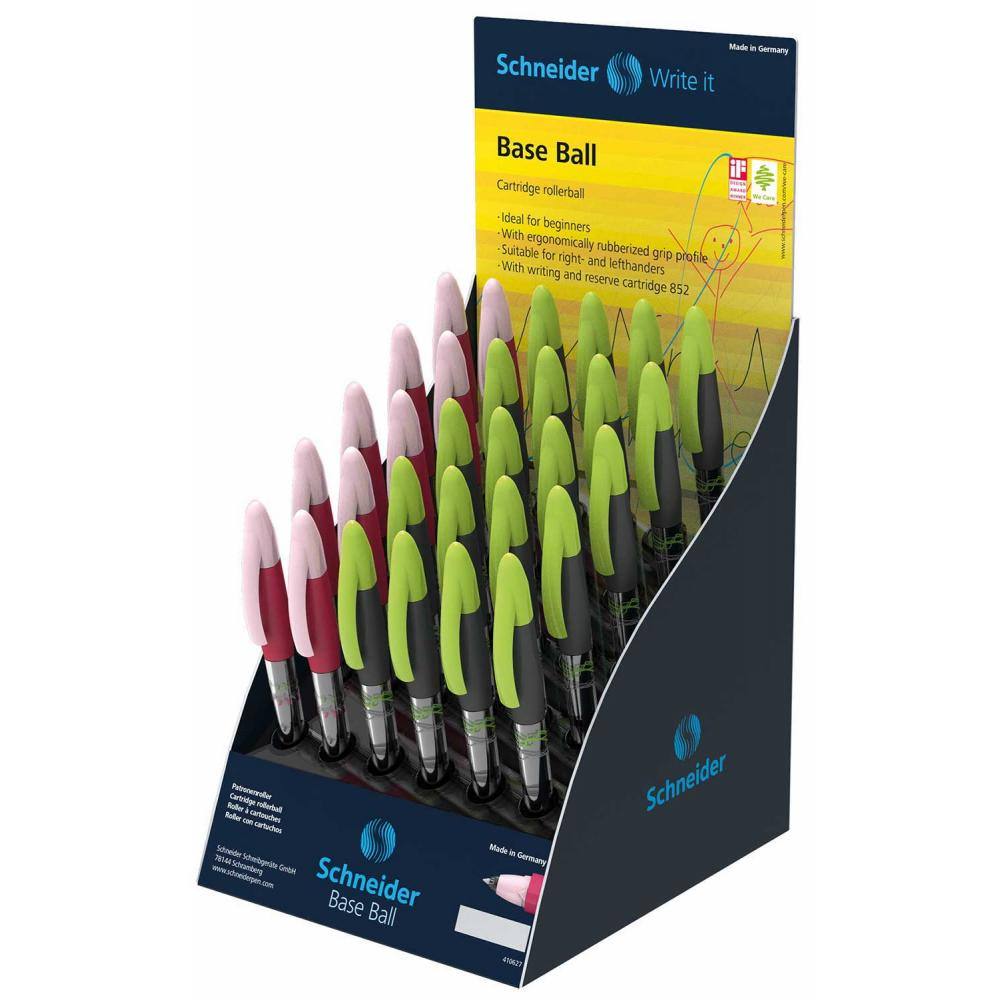 Pisalo Base Ball ima ergonomsko oblikovano držalo za prijetno in udobno pisanje. Pisalo je primerno tako za levičarje kot desničarje.#13#10#13#10V rolerju Base Ball je za tekoče pisanje na novo razvita bombica 852 s črnilom, ki se ne razmaže. Ta postavlja nove standarde na področju enostavnosti pisanja in zasenči vse svoje predhodnike. Regulator črnila zagotavlja stalen ter enakomeren dotok črnila od začetka do konca. Nova formula zagotavlja še hitrejše sušenje črnila. Vsaka bombica ima svojo konico za pisanje. Črnilo v modri barvi je brisljivo. Bombice 852 so dobavljive še v črni, rdeči, zeleni, pink, svetlo modri in svetlo zeleni barvi ter so pakirane v škatlici po 5 kosov. Namenjene so tudi ostalim Schneiderjevim modelom pisal, kot so Base Senso, Base Ball, ID Duo, kot tudi za modele pisal drugih proizvajalcev podobnih rolerjev.#13#10