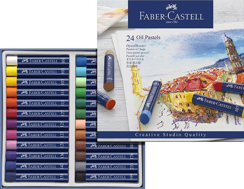 Oljni pasteli Faber-Castell 24/1 z intenzivnimi barvami za ustvarjanje različnih tehnik slikanja.