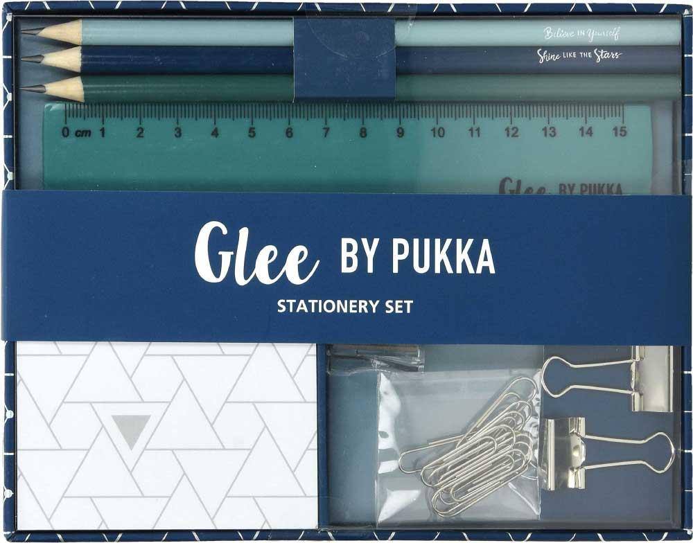 pisarniški set Pukka Glee vsebuje 3 svinčnike, ravnilo, sponke, ščipalke za papir, radirko, samolepilne lističe in šilček.