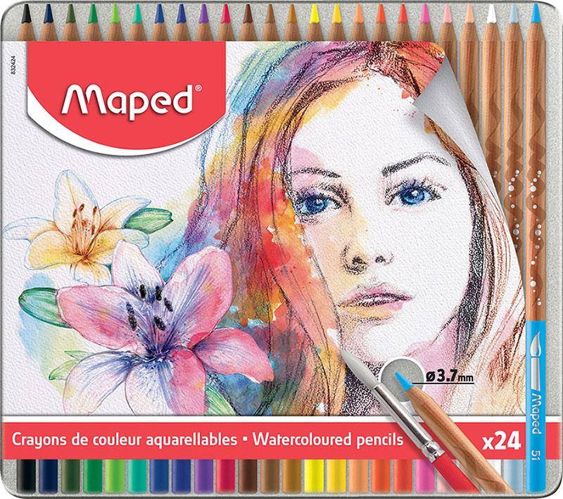 Barvice Artists Maped so kakovostne akvarelne barvice za ljubitelje risanja. Barvice imajo ergonomsko obliko za boljši oprijem in ojačano mino proti lomljenju, debeline 3,7mm. Barve so intenzivne z akvarelnim učinkom. Barvice so pakirane v privlačni kovinski embalaži z priloženim čopičem. V setu je 24 barvic + okrogel čopič.