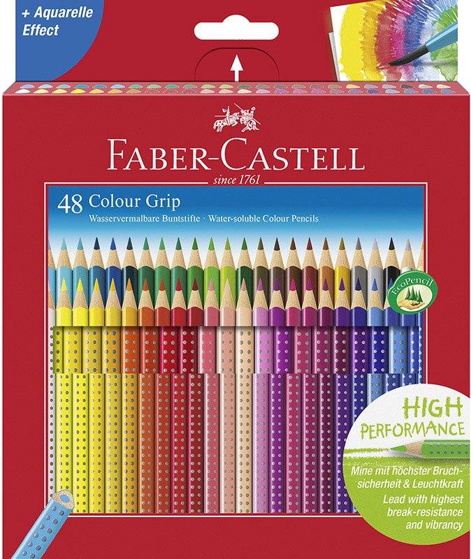 Barvice Faber Castell so visokokakovostne barvice z grip oprijemom za boljši in pravilni oprijem barvice, mine so odporne na lomljenje, barve so intenzivne in v stiku z vodo dosežejo akvarelni učinek. V kartonskem etuiju je 24 različnih odtenkov.